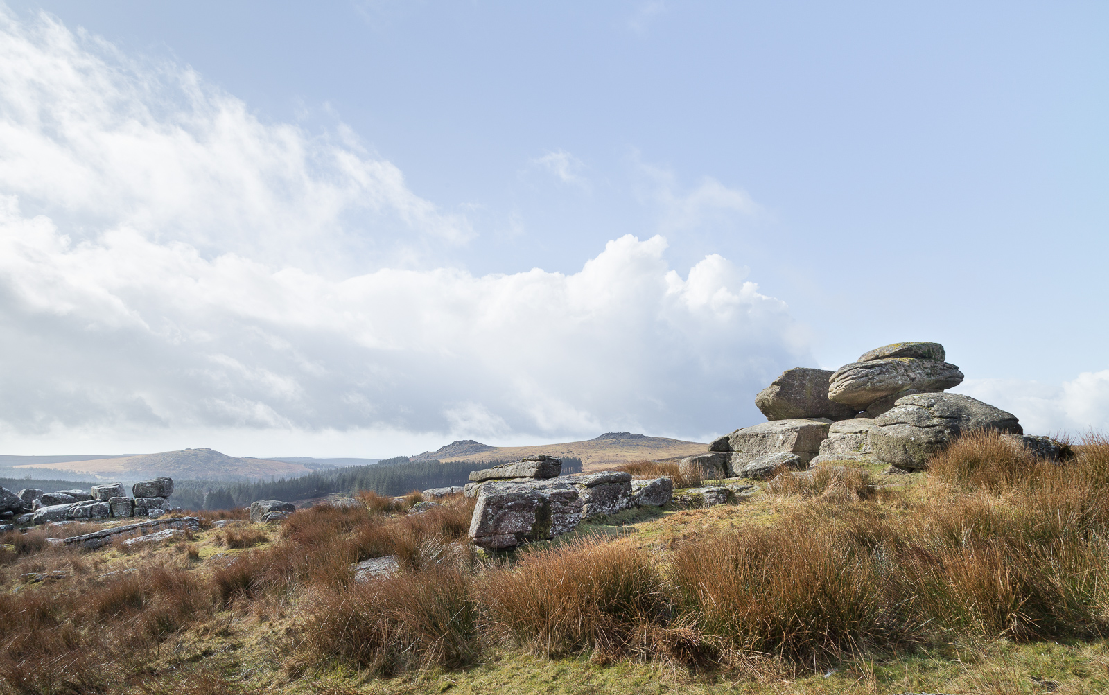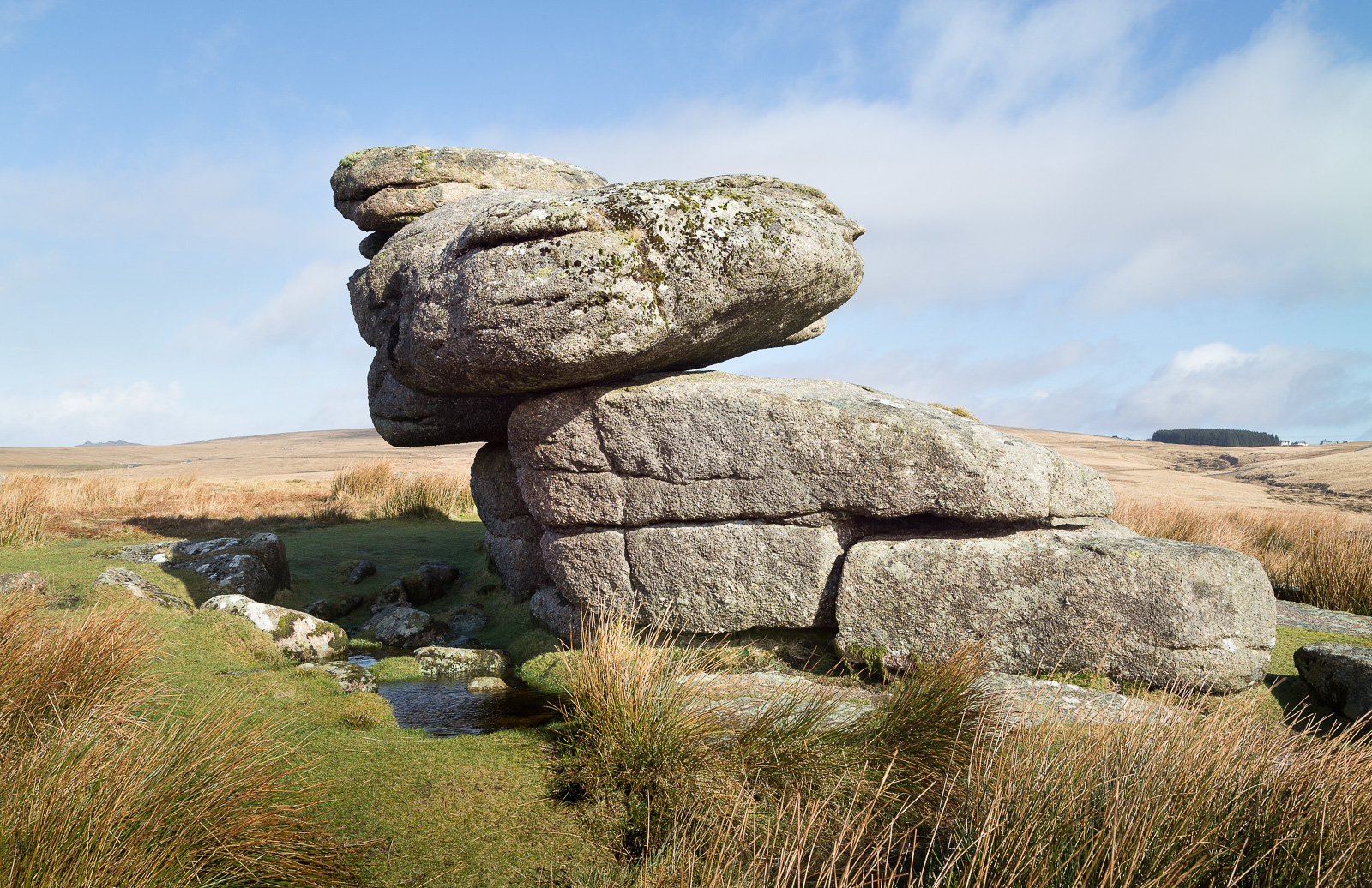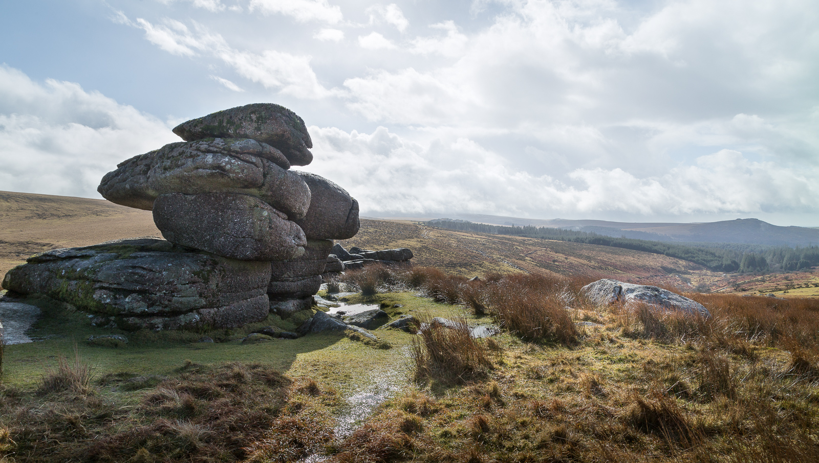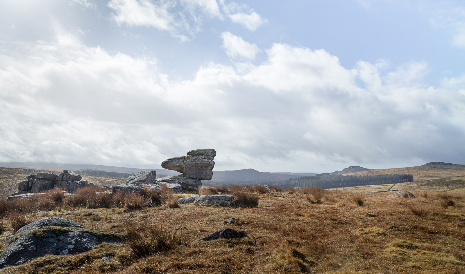 My personal favourite image from the day though was taken from a short walk up from the stone (and the tor), and puts it all into the context of the surrounding tors, Sheeps Tor, Sharpitor and Leather Tor. The logan looks quite at home surrounded by these much higher peaks. And just a little bit like Snoopy from here? Or is that just me!