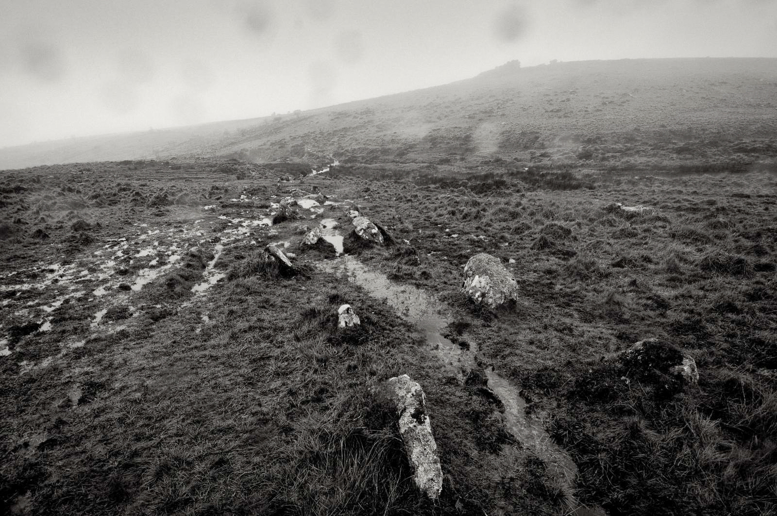 The photograph at the top of the post is the first one I took when I arrived there last week, just as the sleet was doing its worst. To me, the light is gorgeous: subtle, understated, anything but dramatic, but very Dartmoor. It was taken from just beyond the stone, looking across to Sheeps Tor. Here’s the photograph again. In the original version (much larger than posted here, I’m afraid) the sleet is deliciously visible on the right of the frame.