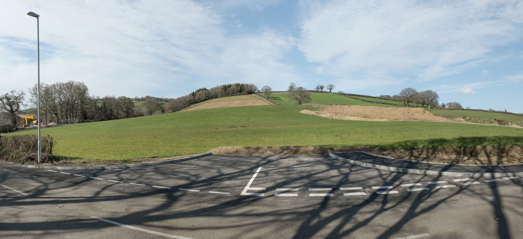 I’ve been watching this hill for a few months now, ever since the first signs were erected. The road here is on the edge of the town of Bovey Tracey, one of the attractive ‘gateway to Dartmoor’ towns. At far left is a digger and further left, out-of-picture, are large storage tanks of dry mortar and new trenches for essential services. Beyond them are the first of the new houses in various stages of completion.