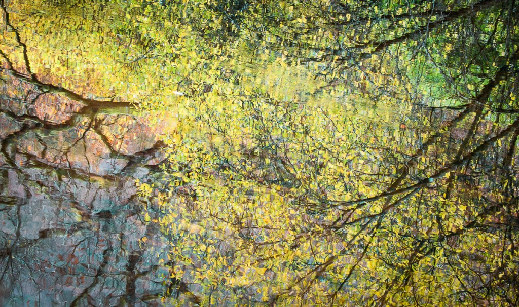 In 2019 I created several multiple exposure images of the River Teign at this point. You’ll find some of them in my Portfolio section. I was reminded of why I made them immediately I saw this stretch of the river again. Through clear water I could see stones on the river bed, reflections of tree branches on the surface, patterns of swirling water, constantly changing, and leaves drifting downstream. How to capture all of this in one image, except as a multiple exposures ? I had to make more this year. Here are a few, and if you don’t like them, it’s ok – they’re included to try to convey an impression rather than details, and many people relate only to the detail. You can view these images at a larger size if you click on them.