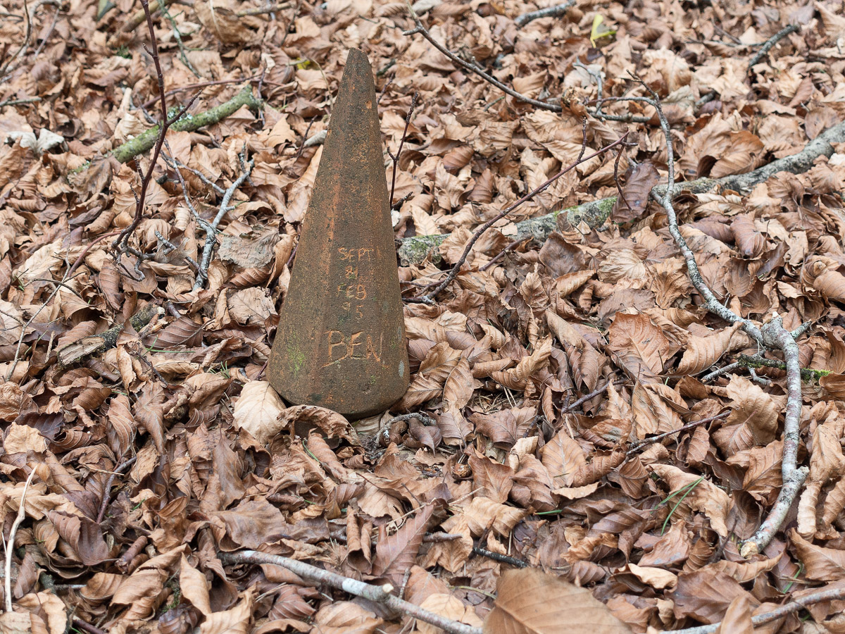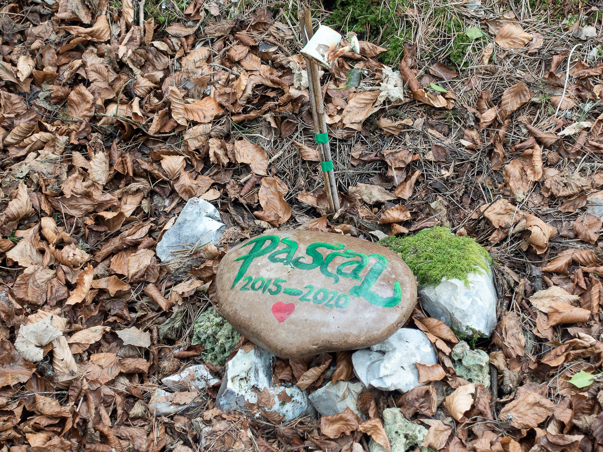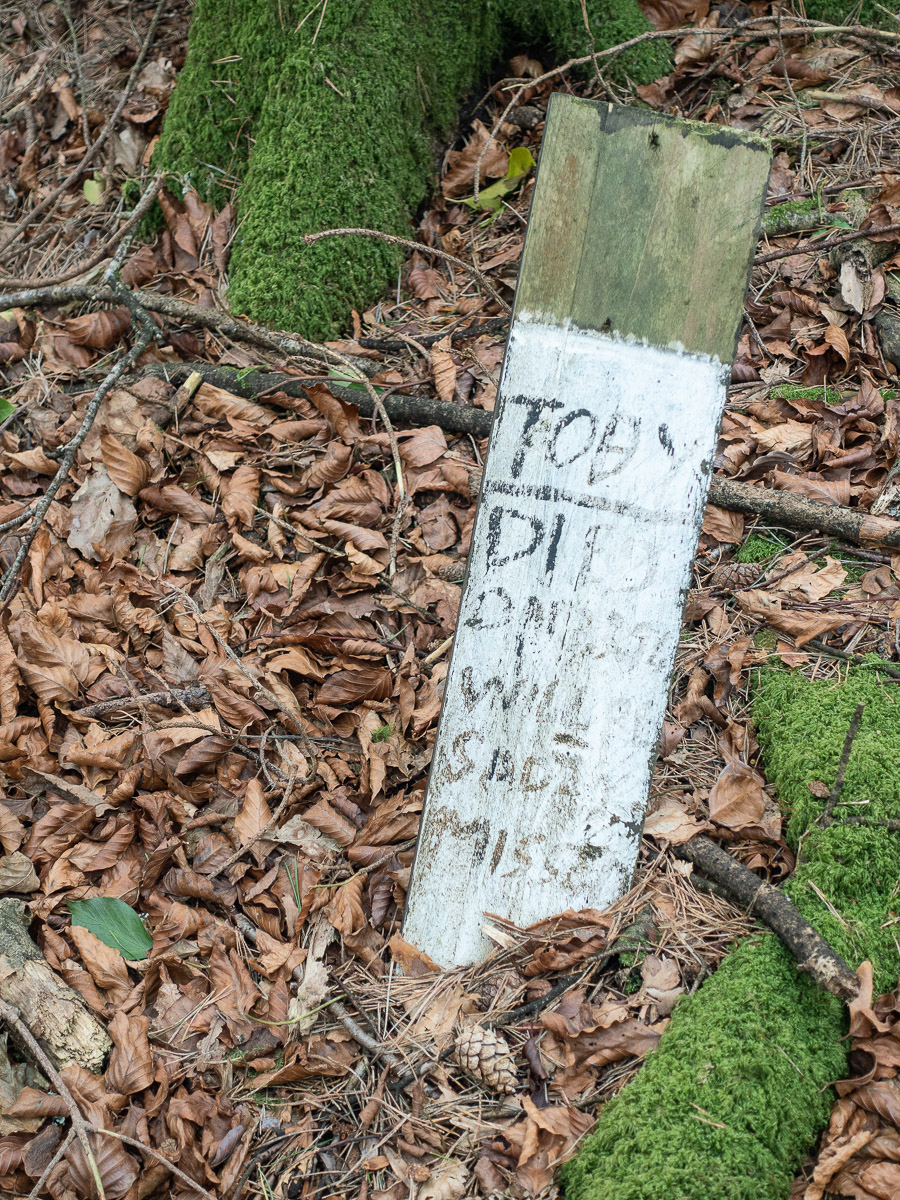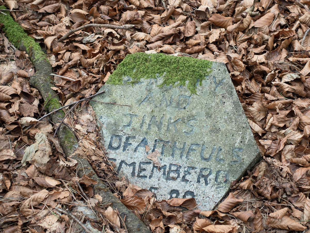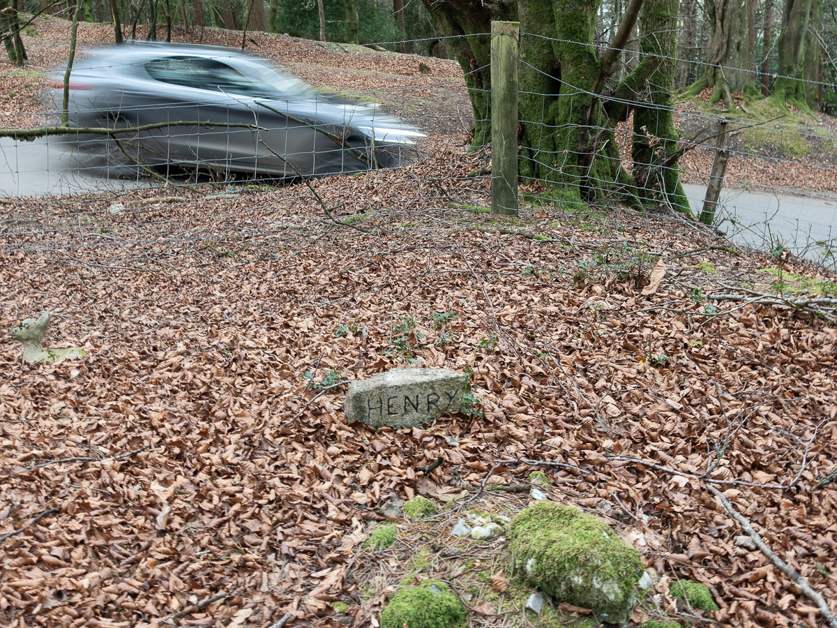 It seems mostly intact – for now. Some stones / plaques are difficult to read, many are breaking up and several of those I viewed with a long lens from the roadside last time seem to have fallen down the steep bank and are lost among the leaves. But a few are still clearly being maintained, more than 30 years after the pets died. Isn’t that remarkable? There were, of course, little markers I’d not seen previously, because I didn’t have so much access. Here’s a second gallery of some of those.