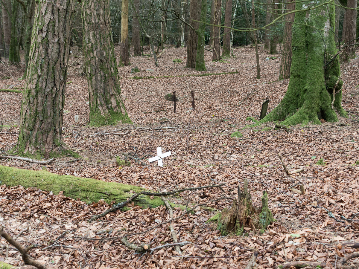 Lots of trees have been felled in the area near the site of the cemetery, and although there are now more (temporary) places to pull in and park, it looks very much like work in progress, and the first thing I noticed was that the wire fencing has been flattened around the site’s road-side perimeter.