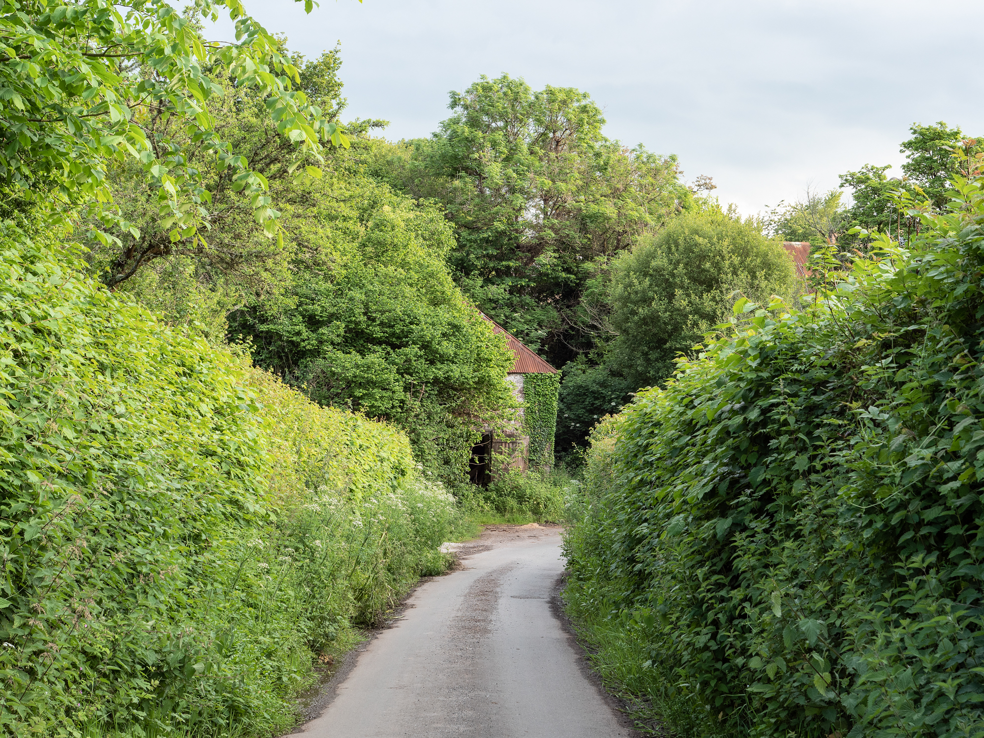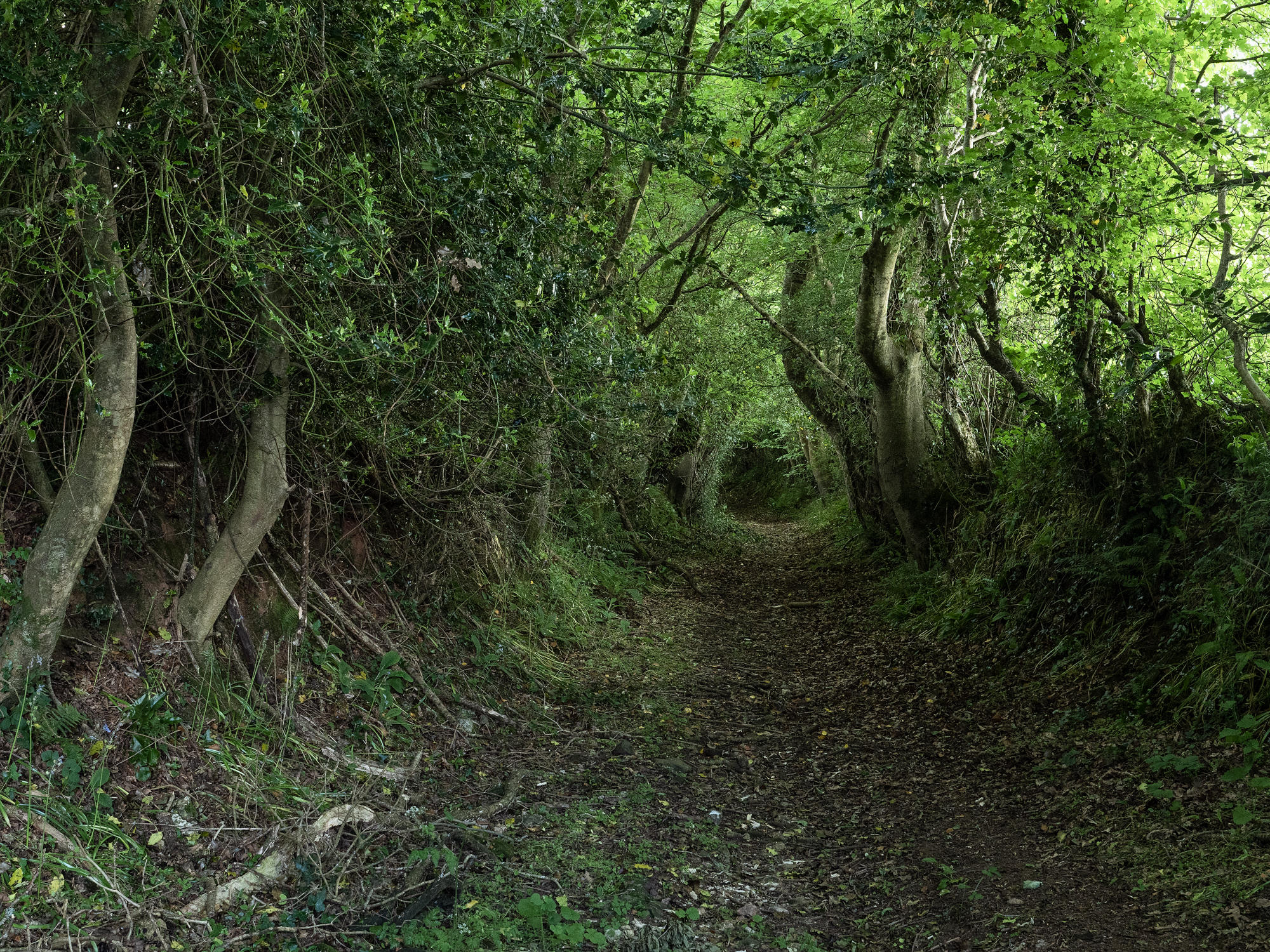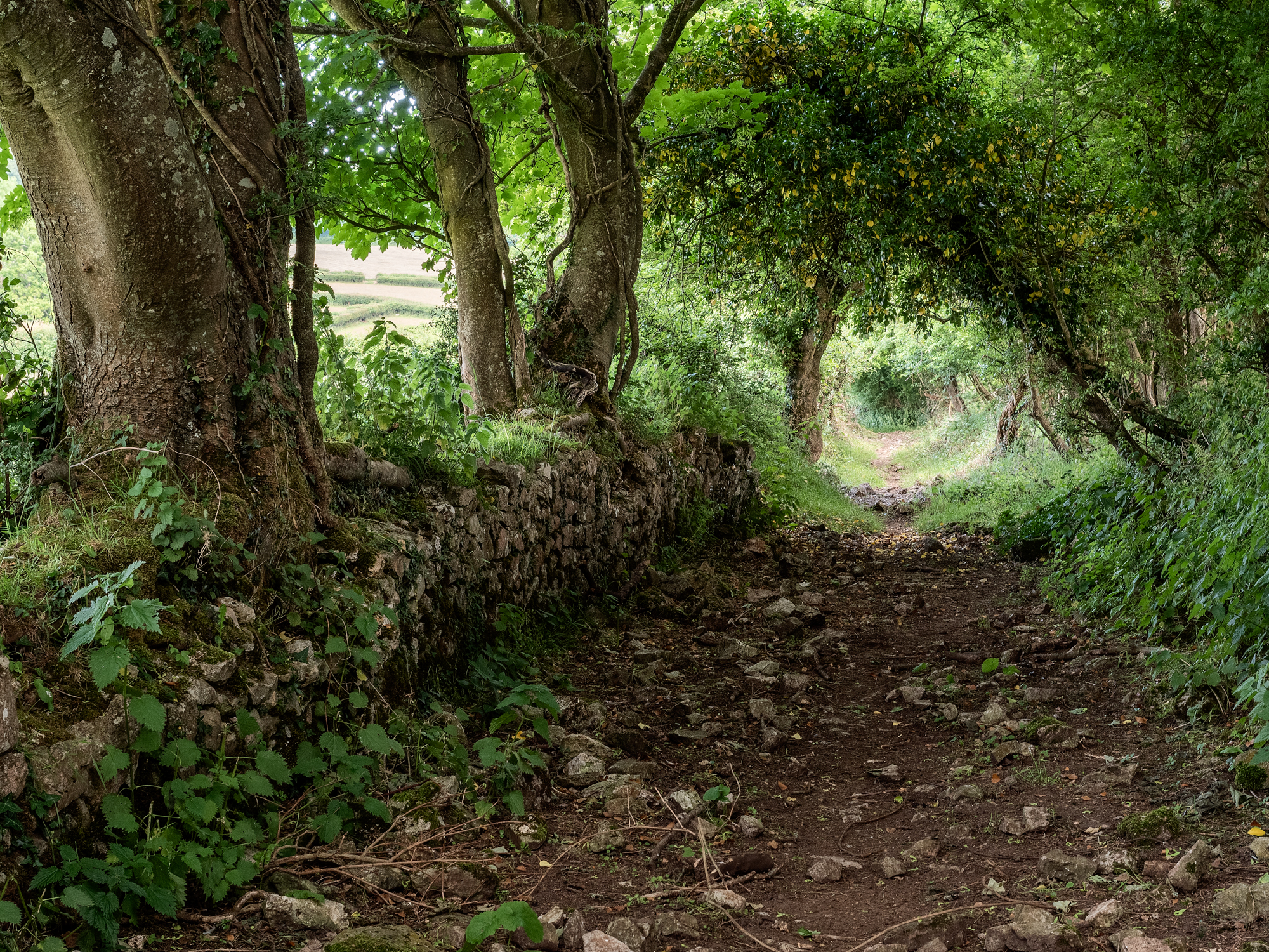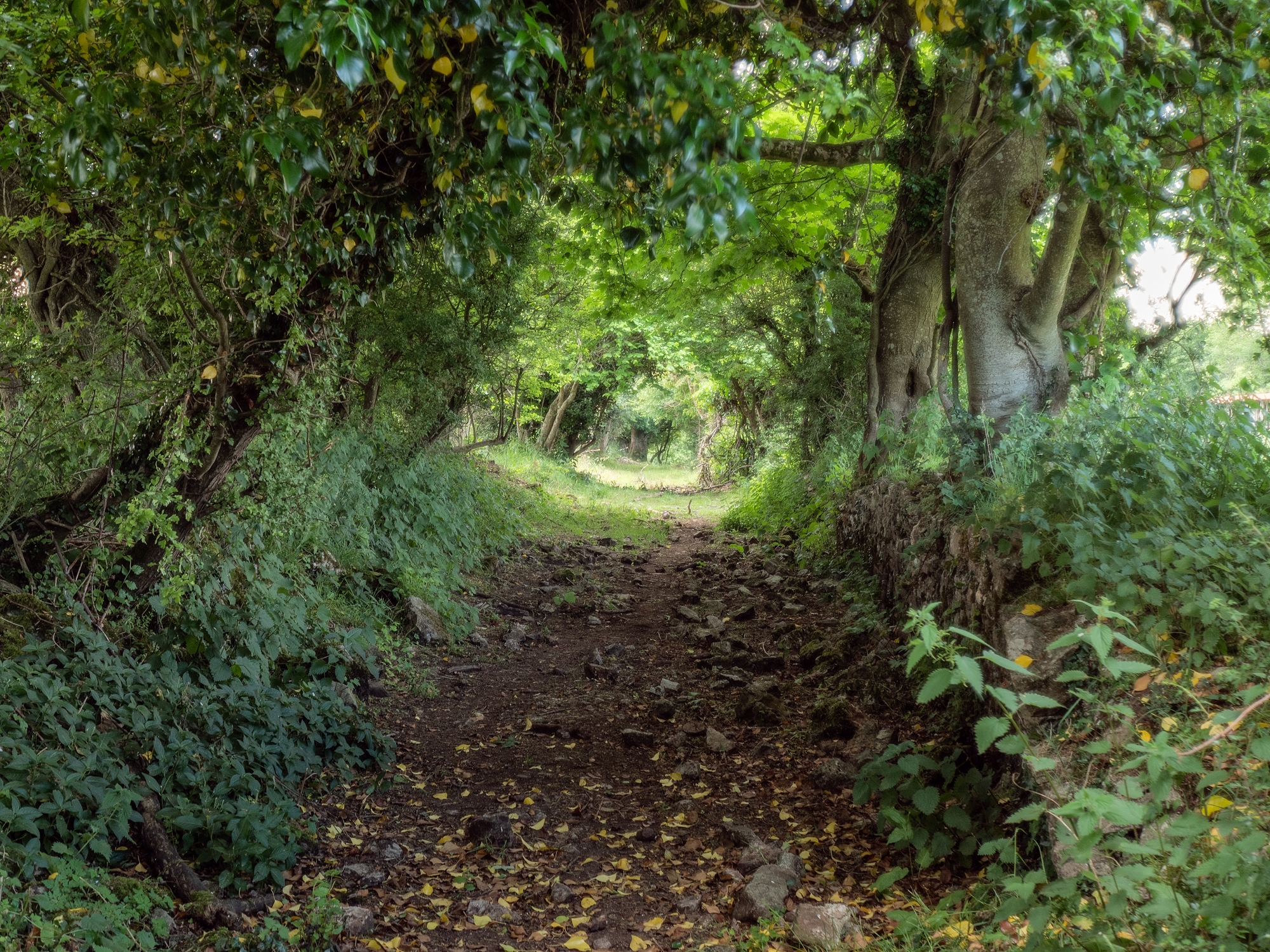 I wanted to head to the darker part of the lane. It’s not a holloway because it’s not a sunken lane, but it is effectively cocooned by trees for much of its length, and the effect is to turn the early evening almost into night time, until you step back outside. From my walking route this is the entrance:
