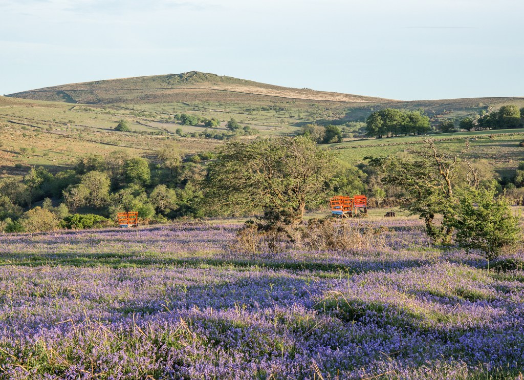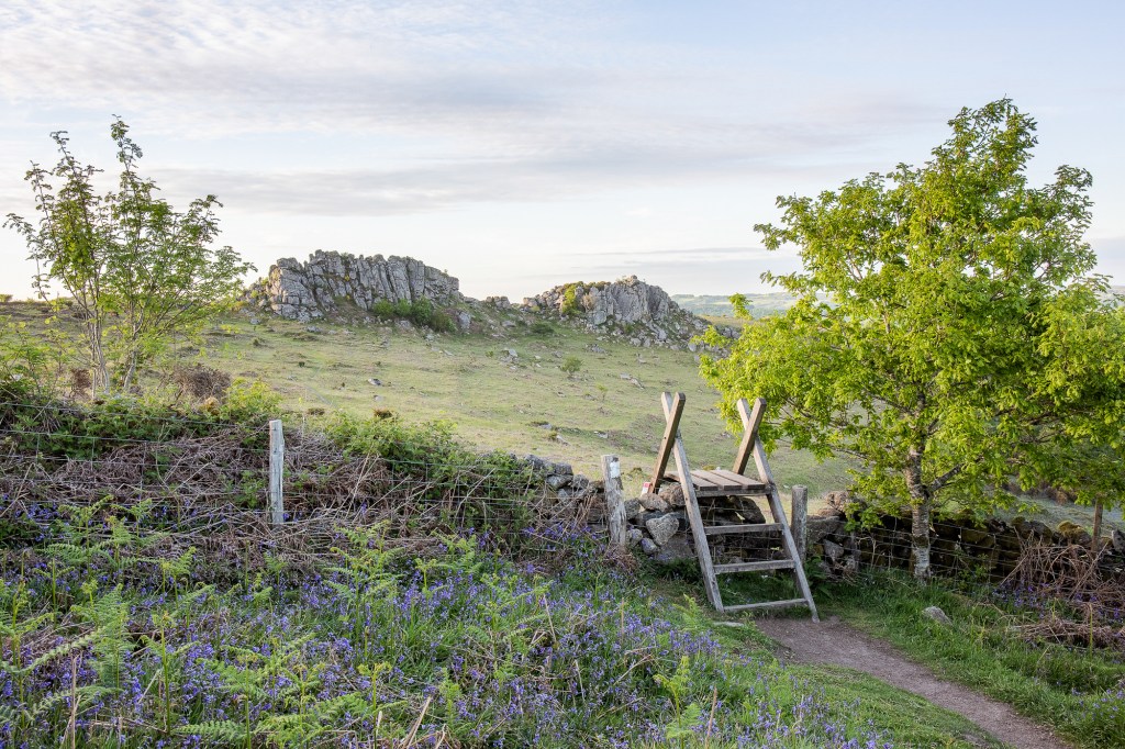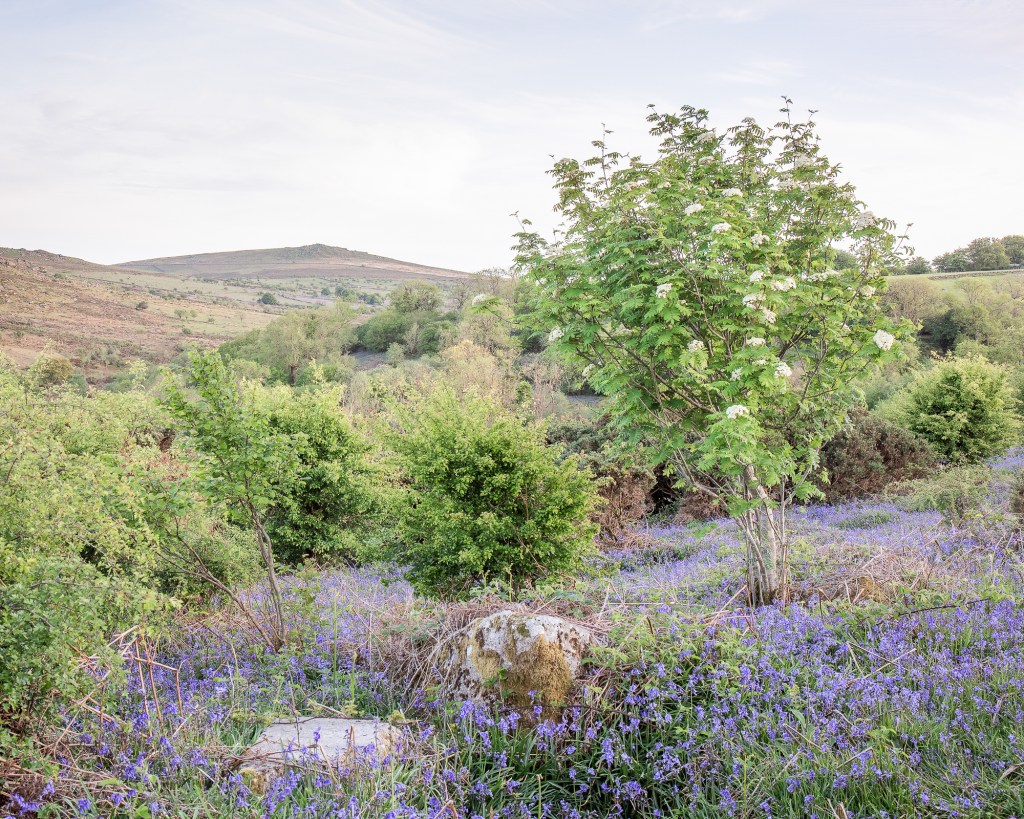 It was the third week in May and after weeks of keeping to strictly local walks from home, I decided to treat myself to a 20 minute car journey from Chudleigh to Dartmoor. I knew the bluebells were still at Emsworthy Barn – they’re alway later on Dartmoor – but a drive to the Saddle Tor pull-in revealed it was packed with cars. That convinced me it would be teeming with photographers and their tripods, just as it was last year, so I drove on. It was early on a Saturday evening, and I took the road to Hound Tor instead, stopping at the pull-in opposite Holwell Lawn. There were another 2 cars and a van there – not too off-putting – and no-one seemed to be getting out of them at that point. I collected my camera and two lenses, walked over to the stile and noticed immediately that, just like last year, the bracken was considerably taller than the bluebells, making a green/blue carpet, rather than the brilliant purple/blue carpet that we used to see from the road. Time to walk beyond all of that. I crossed a couple of fields and headed for a favourite tree.