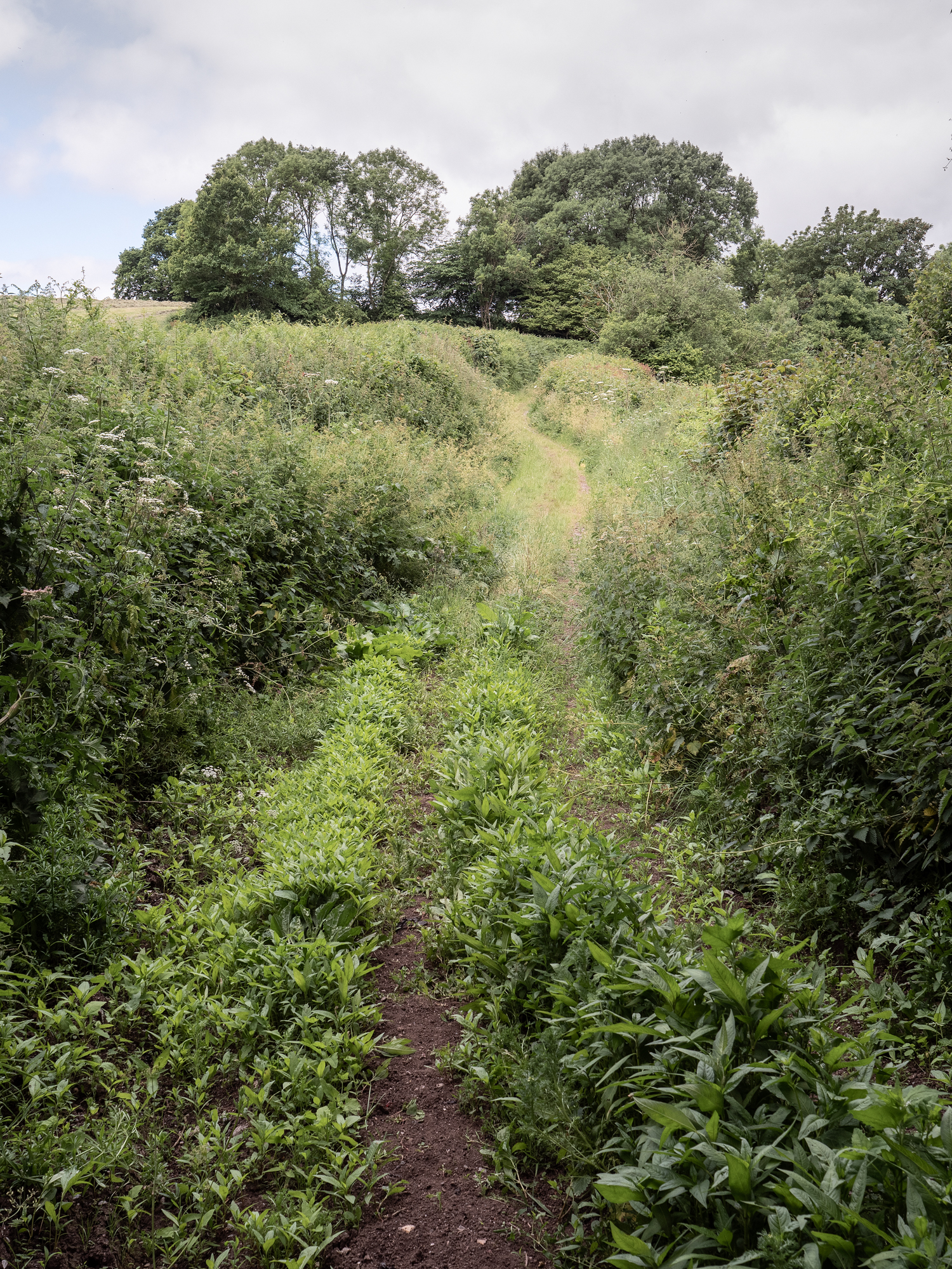 When I’d reached the top my descent back down to Chudleigh had to begin, past lovely farmlands, looking at channels perhaps 8-10 feet below surface level on either side of the minor road, that must have been formed by water draining from the Haldon Hills. At the bottom there was a superbly overgrown green lane I wouldn’t be taking, but couldn’t resist photographing.